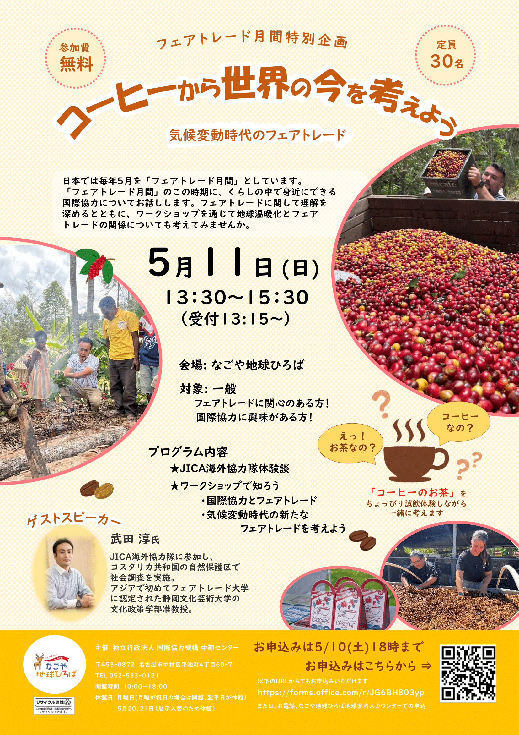 日本では毎年5月を「フェアトレード月間」としています。この時期に、くらしの中で身近にできる国際協力「フェアトレード」についてお話しします。フェアトレードに関して理解を深めるとともに、ワークショップを通じて地球温暖化とフェアトレードの関係についても考えてみませんか。「コーヒーのお茶!?」の試飲体験付き。