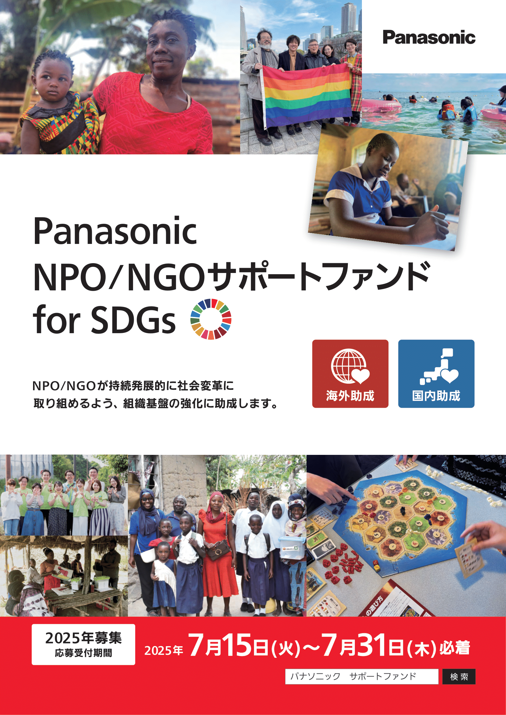 Panasonic NPO/NGOサポートファンドでは、SDGsの大きな目標である「貧困の解消」に向けて取り組むNPO/NGOを対象に、「海外助成」「国内助成」の2つのプログラムで、第三者の客観的視点を取り入れながら組織課題を明らかにする組織診断や、具体的な組織課題の解決、組織運営を改善するための組織基盤強化の取り組みに助成します。