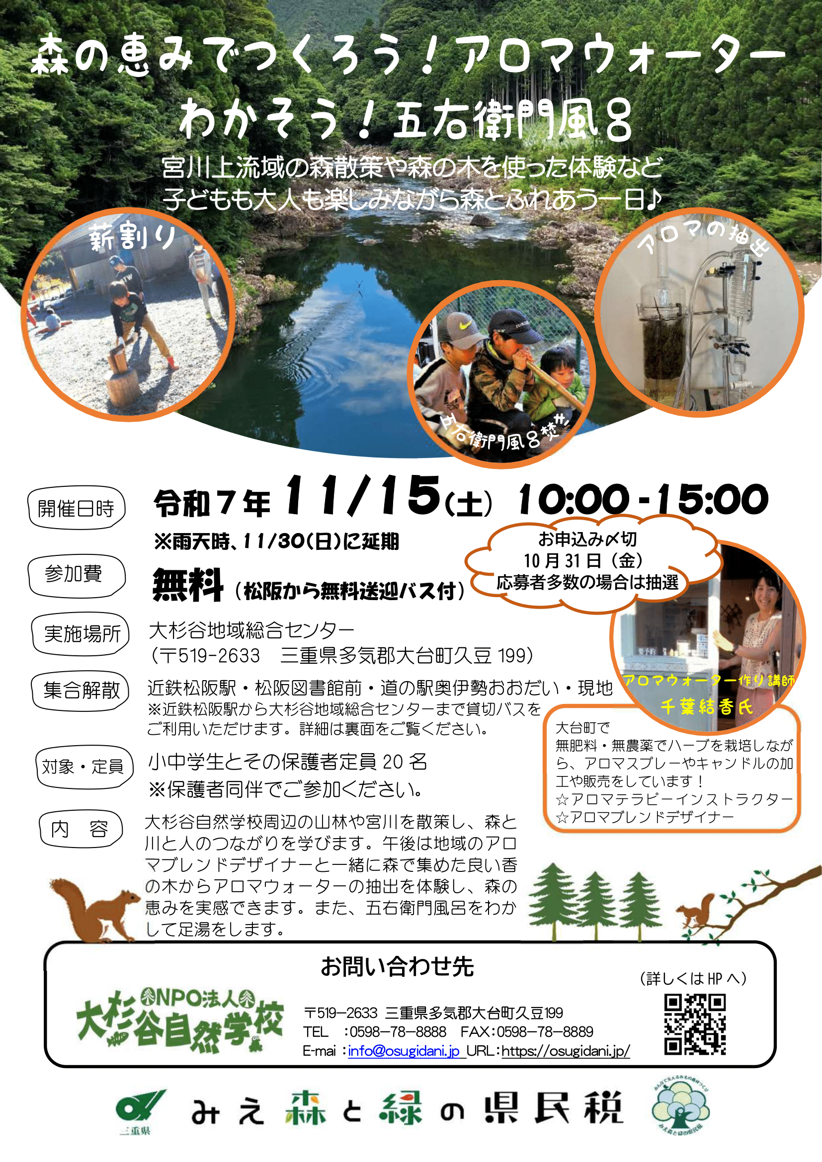 大杉谷自然学校は、「森の恵みでつくろう!アロマウォーター わかそう! 五右衛門風呂」を開催します。