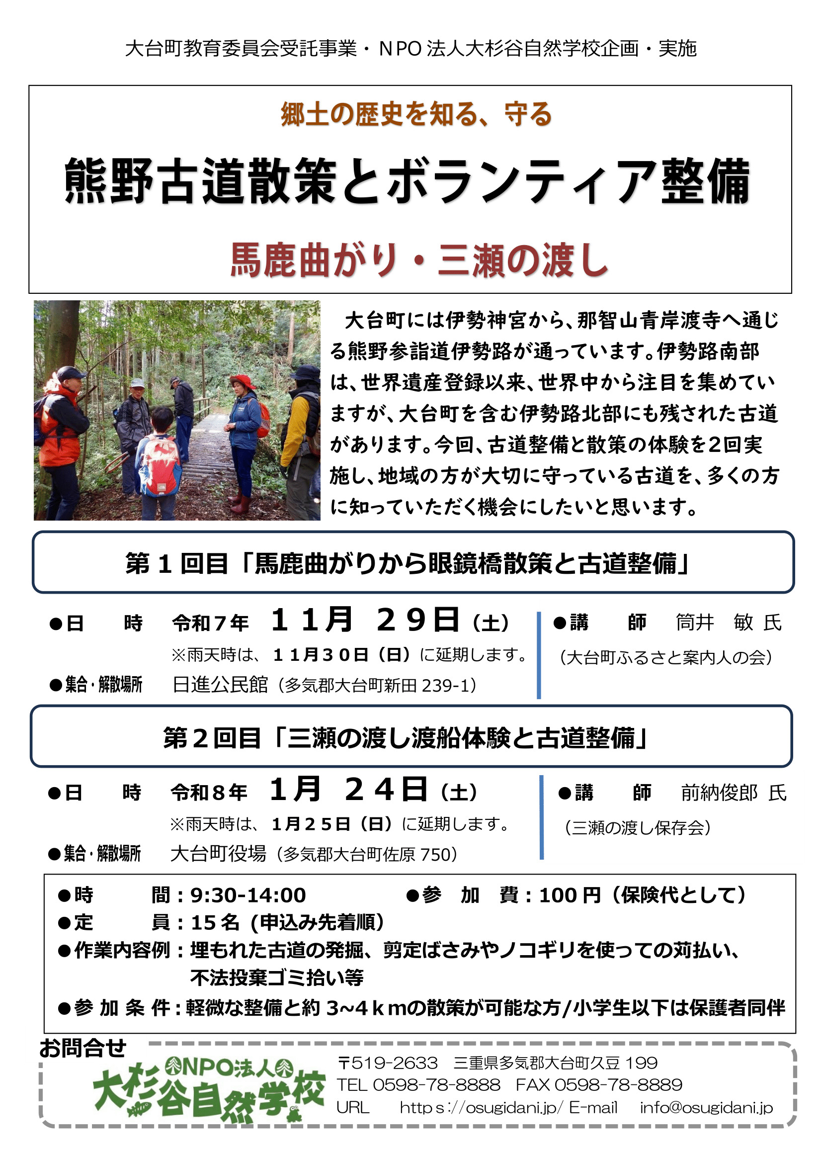 NPO法人大杉谷自然学校は、「三瀬の渡し渡船体験と古道整備」を開催します。