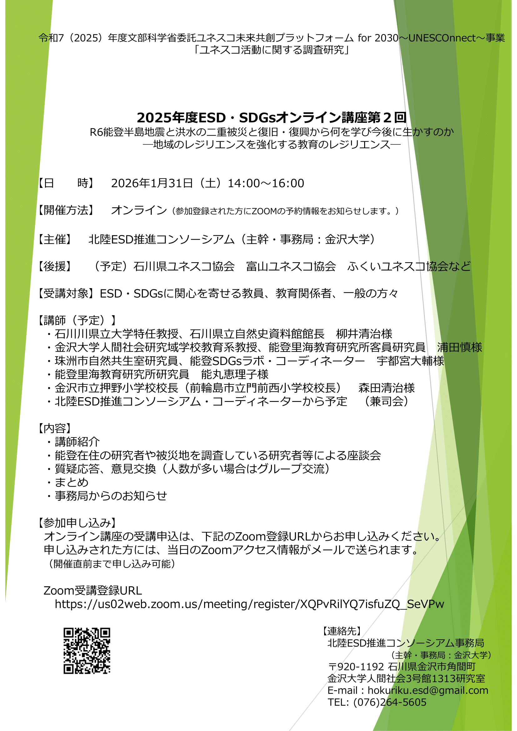 北陸ESD推進コンソーシアムは、2025年度ESD・SDGsオンライン講座第2回「R6能登半島地震と洪水の二重被災と復旧・復興から何を学び今後に生かすのか―地域のレジリエンスを強化する教育のレジリエンス―」を開催します。