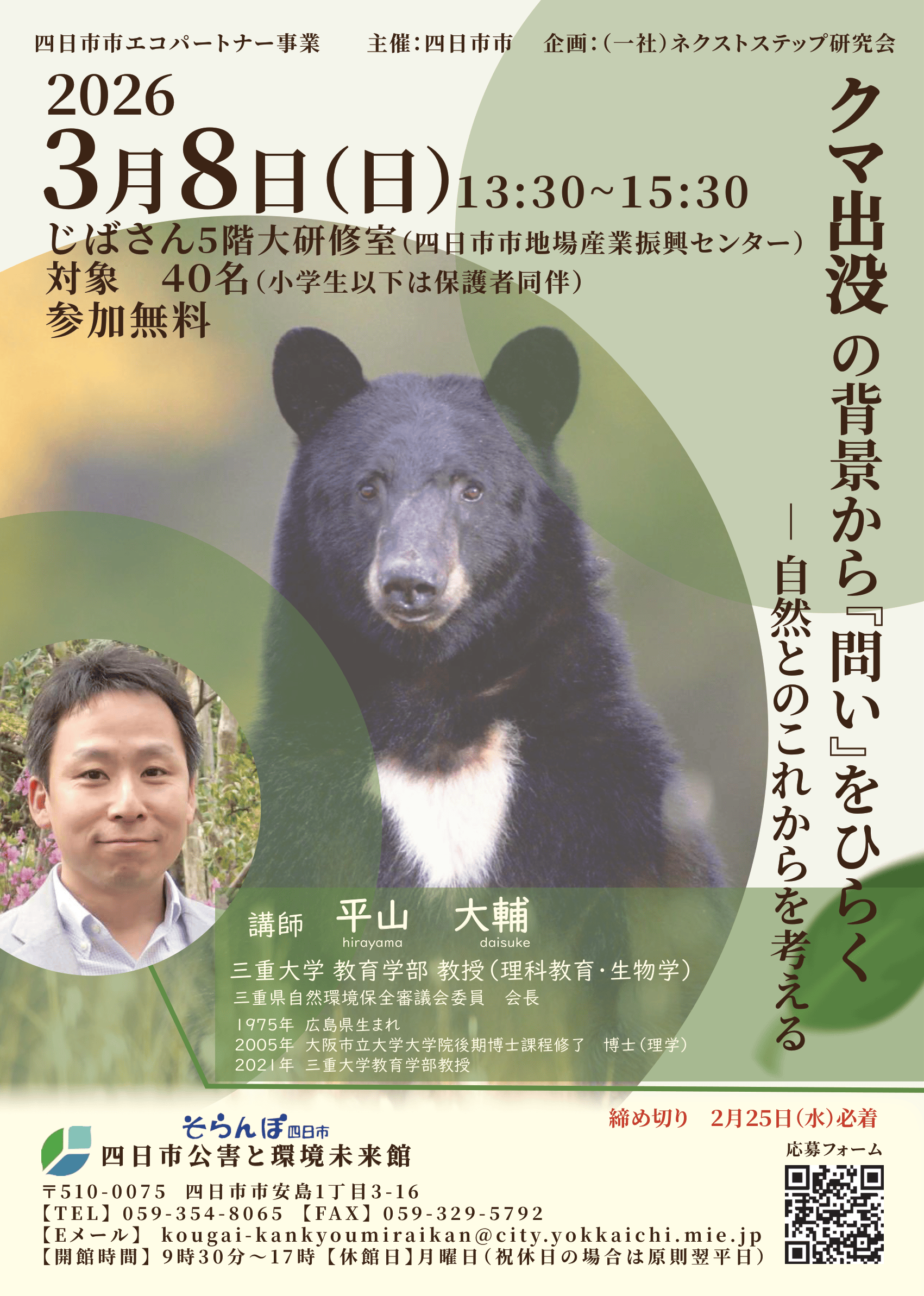 四日市市では現在のところクマの出現は確認されていませんが、野生動物との関係性を考えることは、これからの地域づくりや自然との向き合い方を考える上で重要なテーマです。そこでこのたび、四日市市エコパートナー事業として、環境学習講座「クマ出没の背景から「問い」をひらく―自然とのこれからを考える」を開催することになりました。