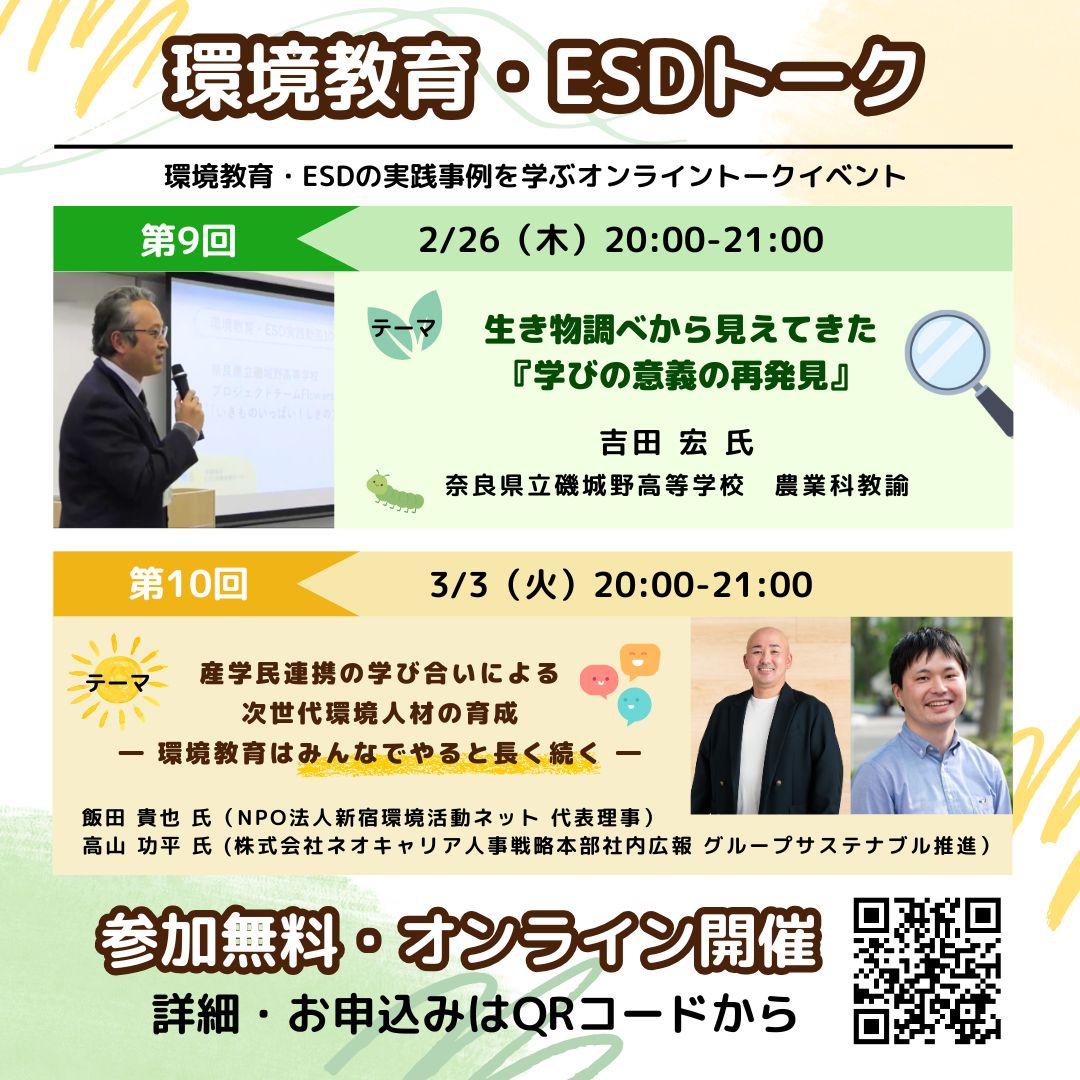 今回の環境教育・ESDトークでは、令和7年度の選定団体からゲストをお呼びして、環境教育・ESDの実践事例について詳しくお話を伺います。