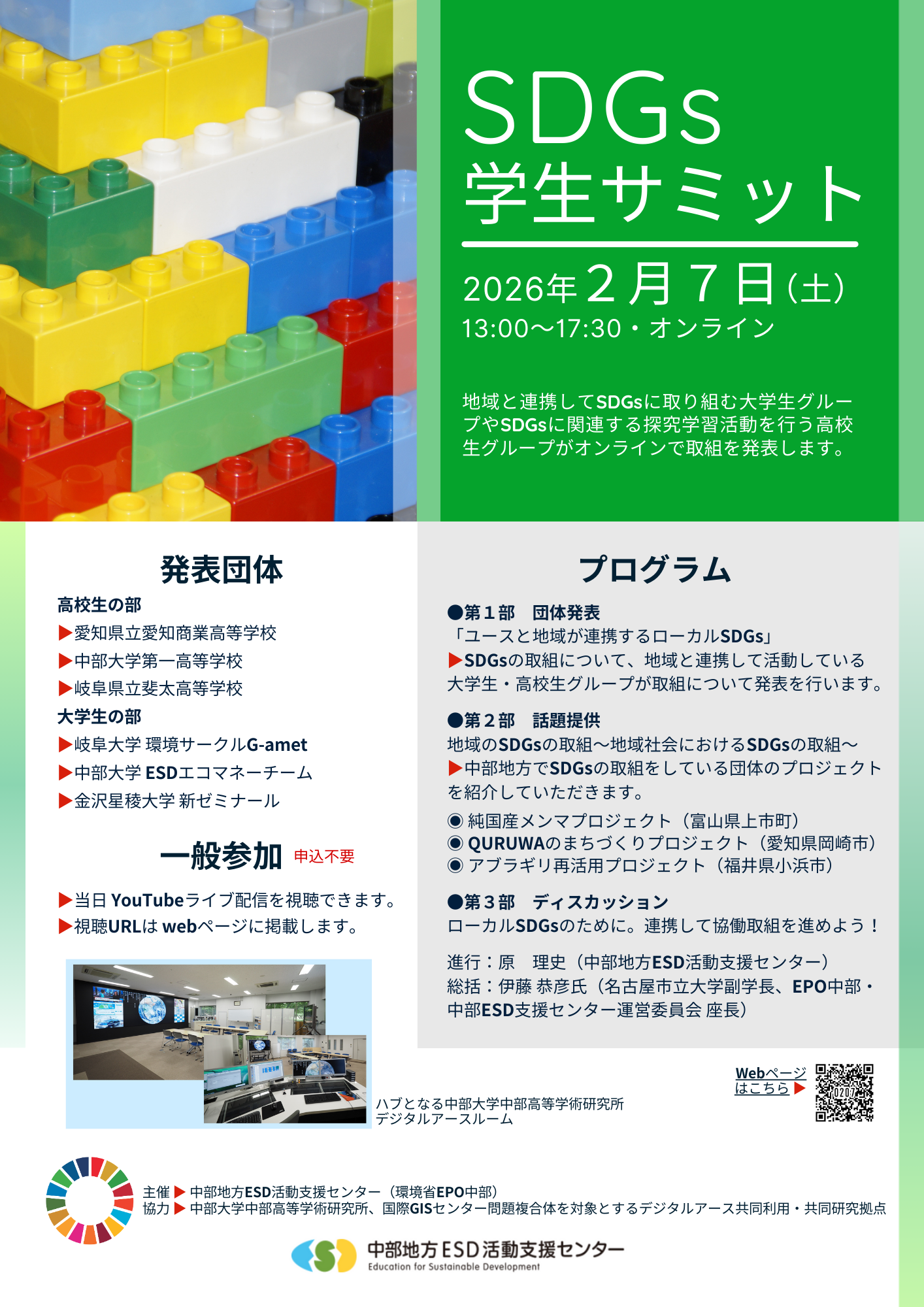 中部地方ESD活動支援センターは、2026年2月7日に開催する「SDGs学生サミット」で発表していただける大学生グループ・高校生グループ(個人)を募集します。